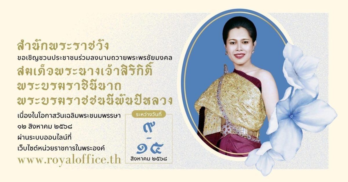 สำนักพระราชวัง ขอเชิญชวนประชาชนร่วมลงนามถวายพระพรชัยมงคล สมเด็จพระนางเจ้าสิริกิติ์ พระบรมราชินีนาถ พระบรมราชชนนีพันปีหลวง เนื่องในโอกาสวันเฉลิมพระชนมพรรษา วันที่ ๑๒ สิงหาคม ๒๕๖๘
