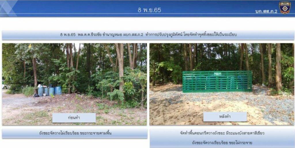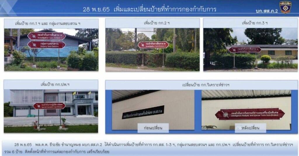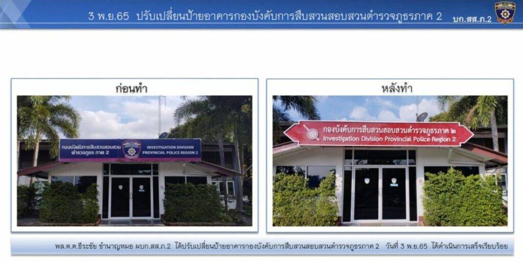 เมื่อวันที่ 7 ธ.ค.65 ผู้สื่อข่าวรายงานว่าที่กองบังคับการสืบสวนสอบสวนตำรวจภูธรภาค 2 (บก.สส.ภ.2) นับตั้งแต่ พล.ต.ต.ธีระชัย ผบก.สส.ภ.2 หรือ ผู้การบิ๊ก เข้ามาเป็นหัวเรือใหญ่ ได้พัฒนาหน่วย ตลอดจนดูแลความเป็นอยู่ของลูกน้องผู้ใต้บังคับบัญชามาอย่างต่อเนื่อง โดยมีการปรับภูมิทัศน์อาคารที่ทำการ ทั้งเปลี่ยนป้ายอาคารที่ทำการ เพิ่มป้ายที่ทำการของกองกับการในสังกัดตลอดจนปรับภูมิทัศน์จัดจุดทิ้งขยะให้เป็นระเบียบ โดยจัดทำพื้นที่คอนกรีตวางถังขยะ มีระแนงกั้นบังสายตา