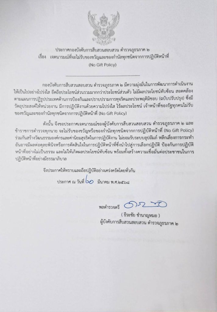 ดังนั้น จึงขอประกาศเจตนารมณ์ของผู้บังคับการสืบสวนสอบสวน ตํารวจภูธรภาค ๒ และ ข้าราชการตํารวจทุกนาย จะไม่รับของขวัญหรือของกํานัลทุกชนิดจากการปฏิบัติหน้าที่ (No Gift Policy) ร่วมกันสร้างวัฒนธรรมองค์กรและค่านิยมสุจริตในการปฏิบัติงาน ไม่ยอมรับระบบอุปถัมภ์ หลีกเลี่ยงการกระทํา อันอาจมีผลต่อดุลยพินิจหรือการตัดสินใจในการปฏิบัติหน้าที่ซึ่งนําไปสู่การเลือกปฏิบัติ ป้องกันการปฏิบัติ หน้าที่อย่างไม่เป็นธรรม และไม่ให้เกิดผลประโยชน์ทับซ้อน พร้อมทั้งสร้างความเชื่อมั่นต่อประชาชนในการ ปฏิบัติหน้าที่อย่างมีธรรมาภิบาล