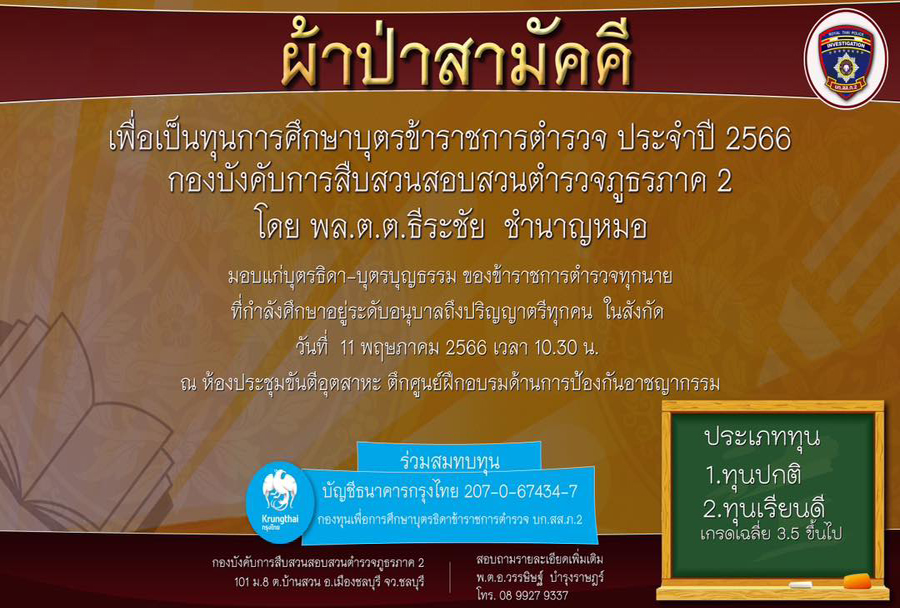 .โดยจะทำการมอบทุนการศึกษา ในวันที่ 11 พฤษภาคม 2566 ณ ห้องประชุมขันตีอุตสาหะ ตึกศูนย์ฝึกอบรมด้านการป้องกันอาชญากรรม กองบังคับการสืบสวนสอบสวนตำรวจภูธรภาค 2