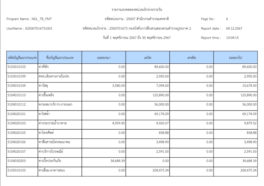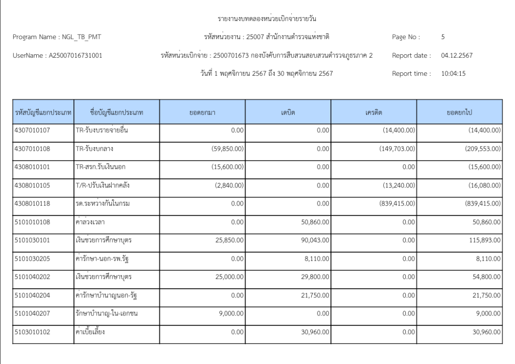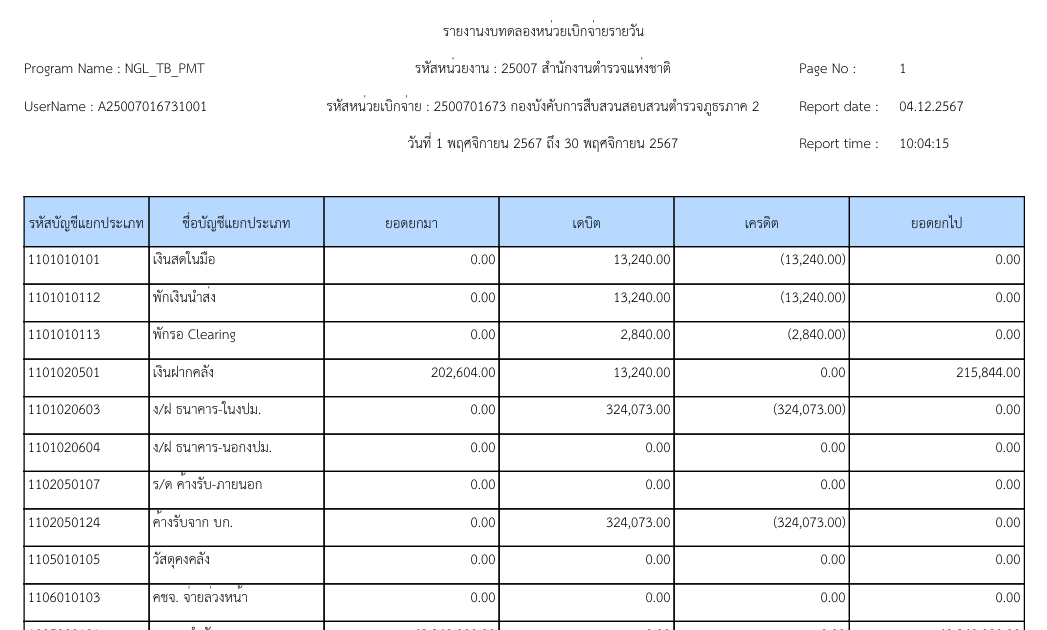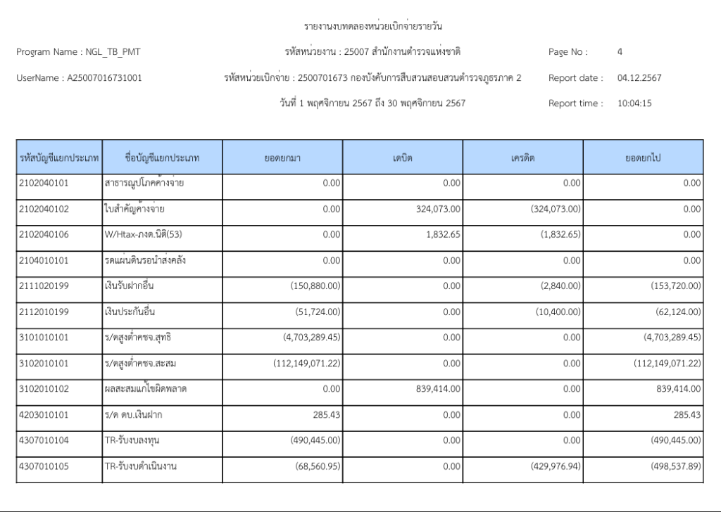 รายงานงบทดลองหน่วยเบิกจ่ายรายวัน