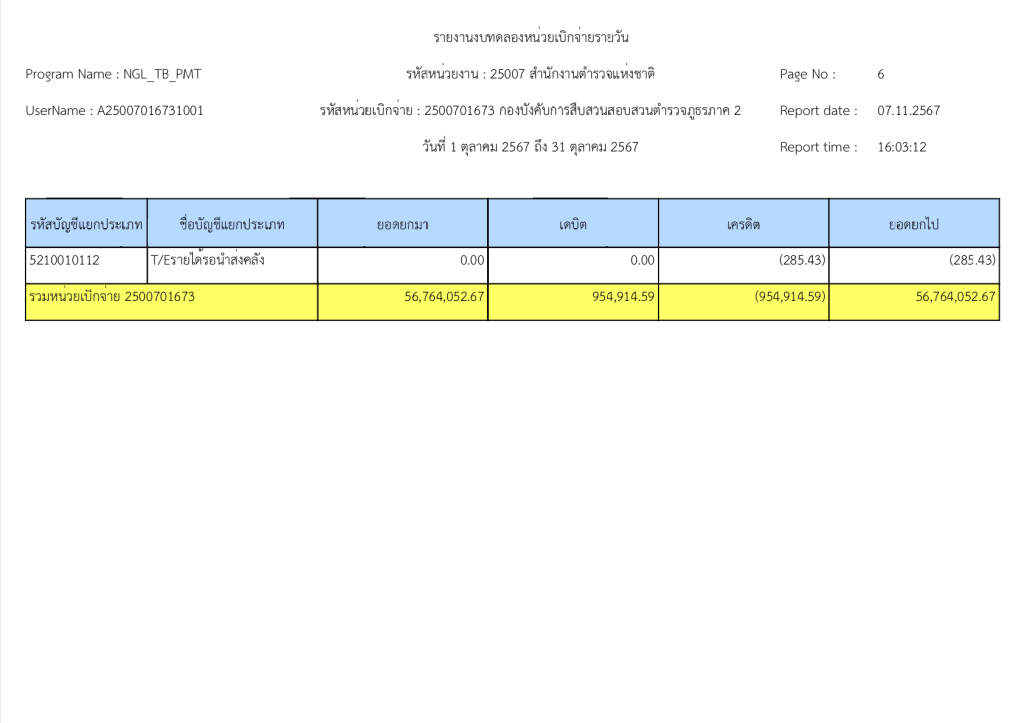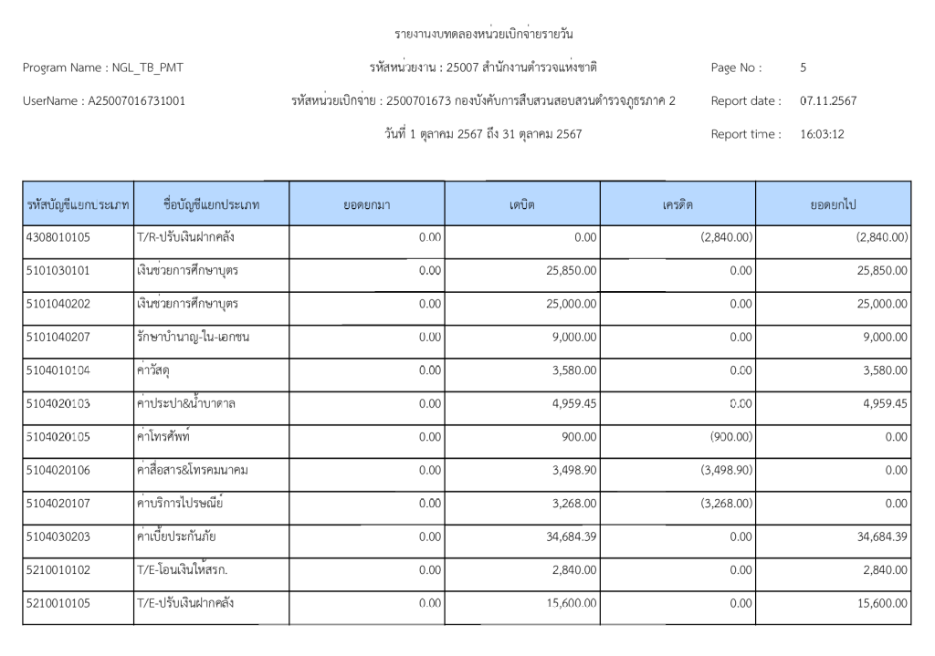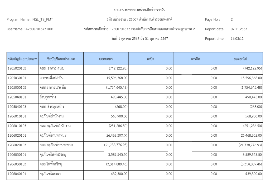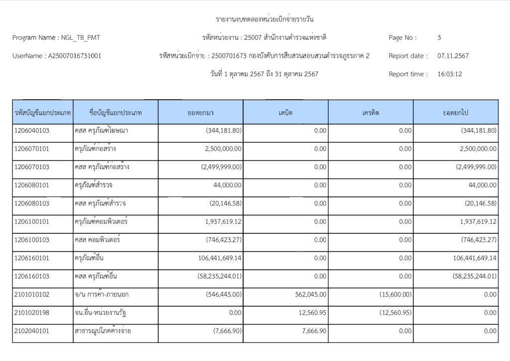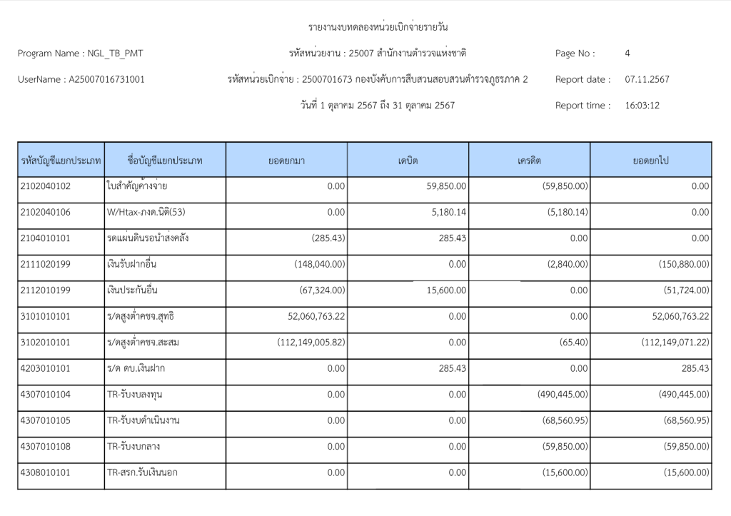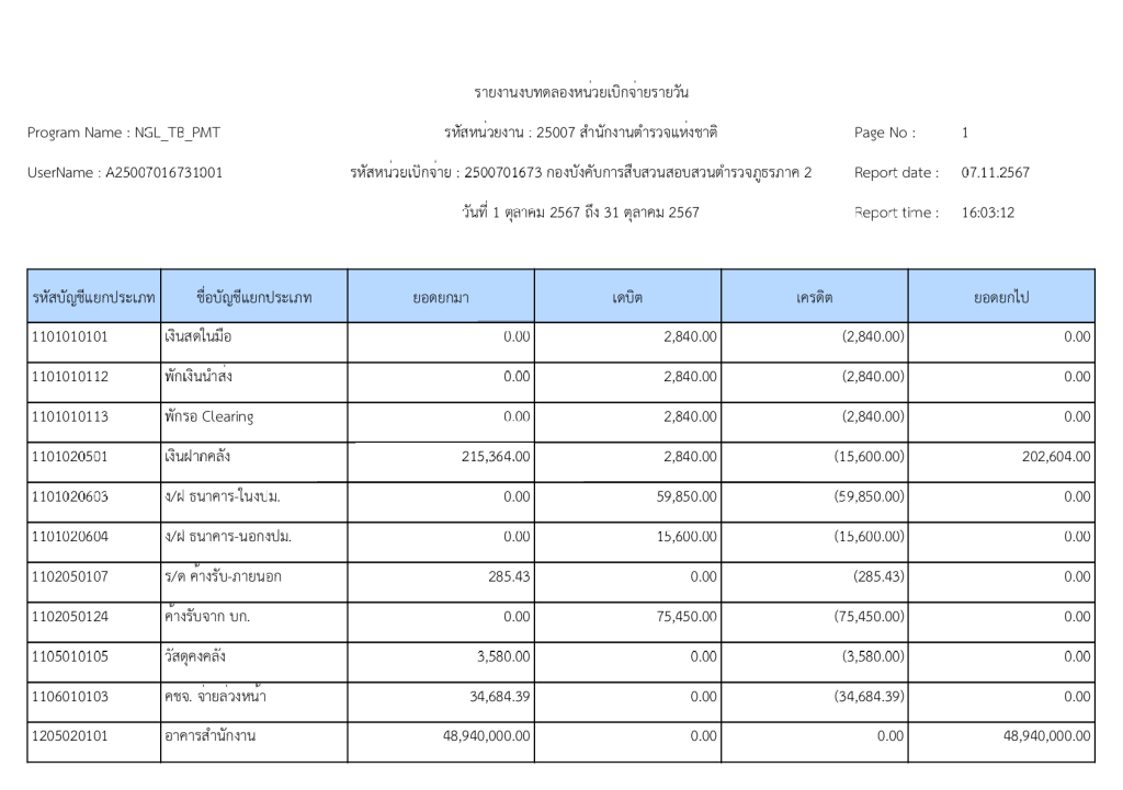 รายงานงบทดลองหน่วยเบิกจ่ายรายวัน วันที่ 1 ตุลาคม 2567 ถึง 31 ตุลาคม 2567 7 พฤศจิกายน 2024 โดย invp265 / ข่าวจัดซื้อจัดจ้าง,งานงบประมาณแผนงาน