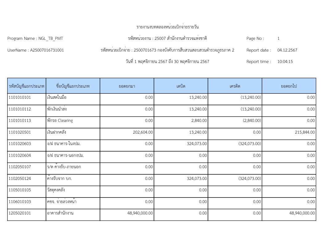 รายงานงบทดลองหน่วยเบิกจ่ายรายวัน